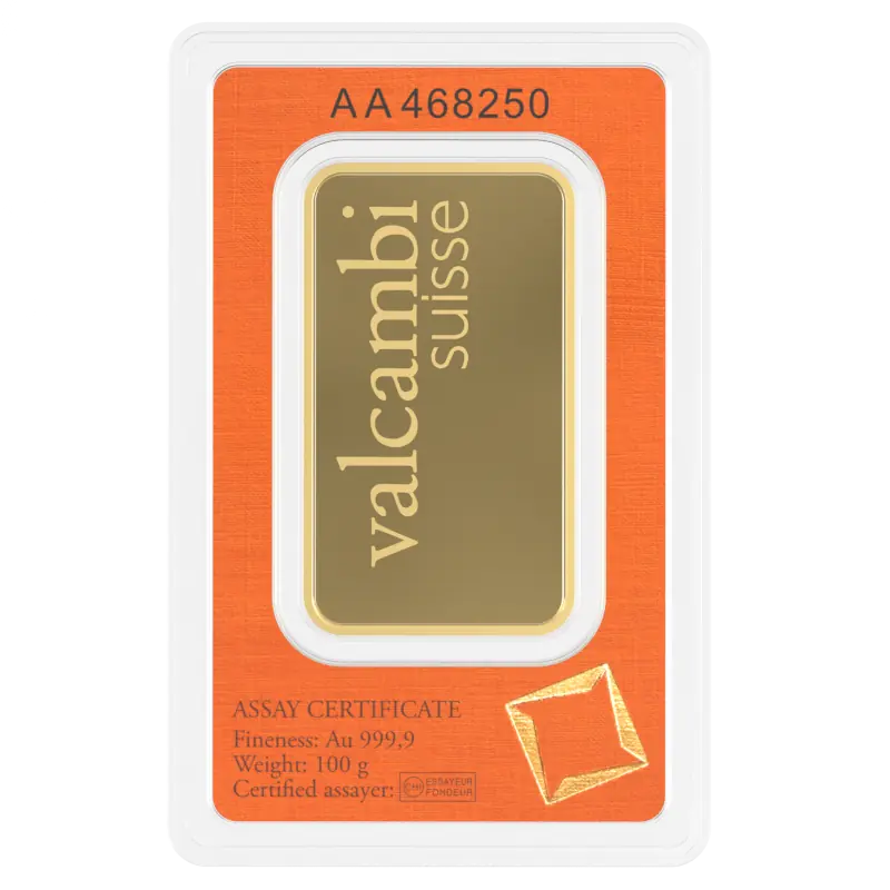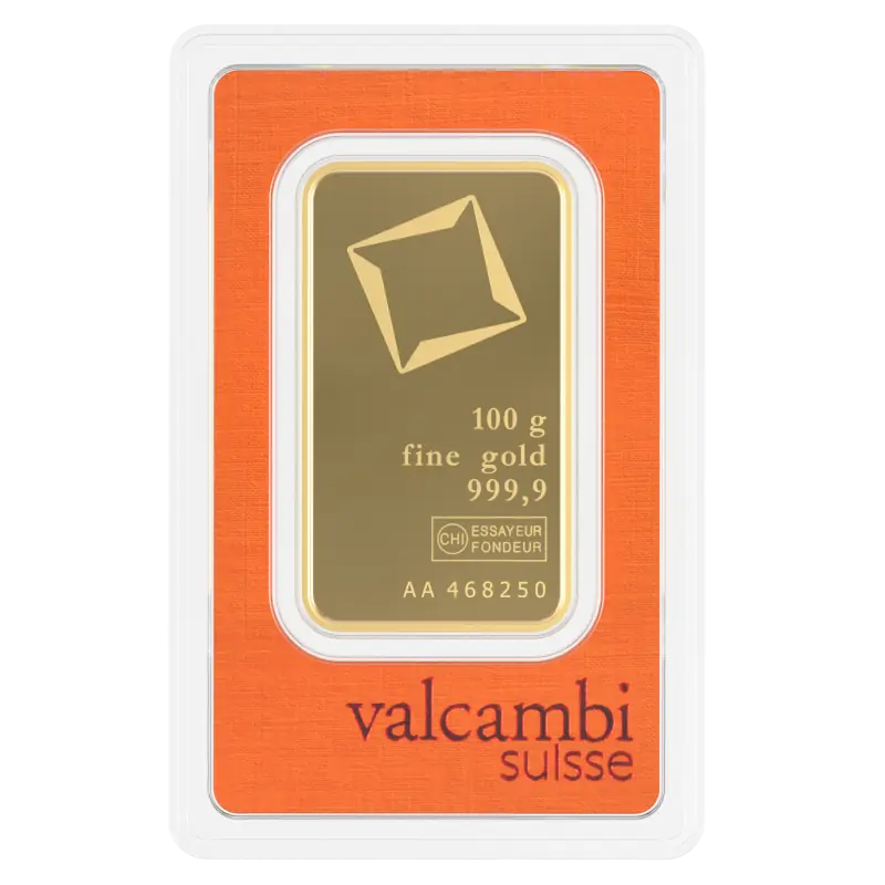 Elke 100-grams Valcambi staaf draagt het Valcambi-logo en biedt een uitstekende investeringsmogelijkheid. Ontdek vandaag nog de schoonheid en waarde van goud met onze hoogwaardige gouden staaf van Valcambi.