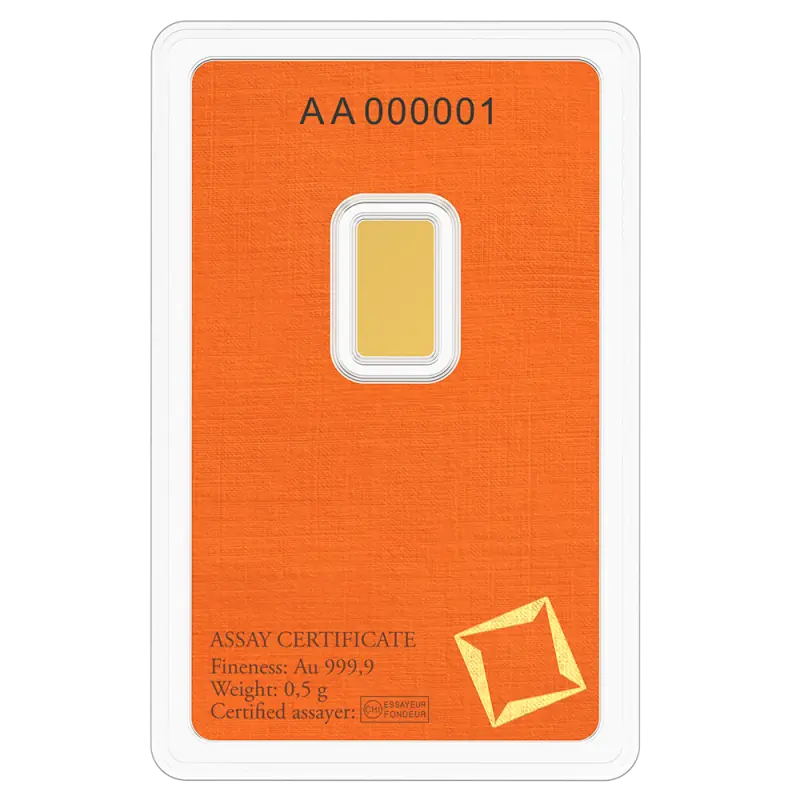 Specificaties van de 0,5g gouden baar van Valcambi: