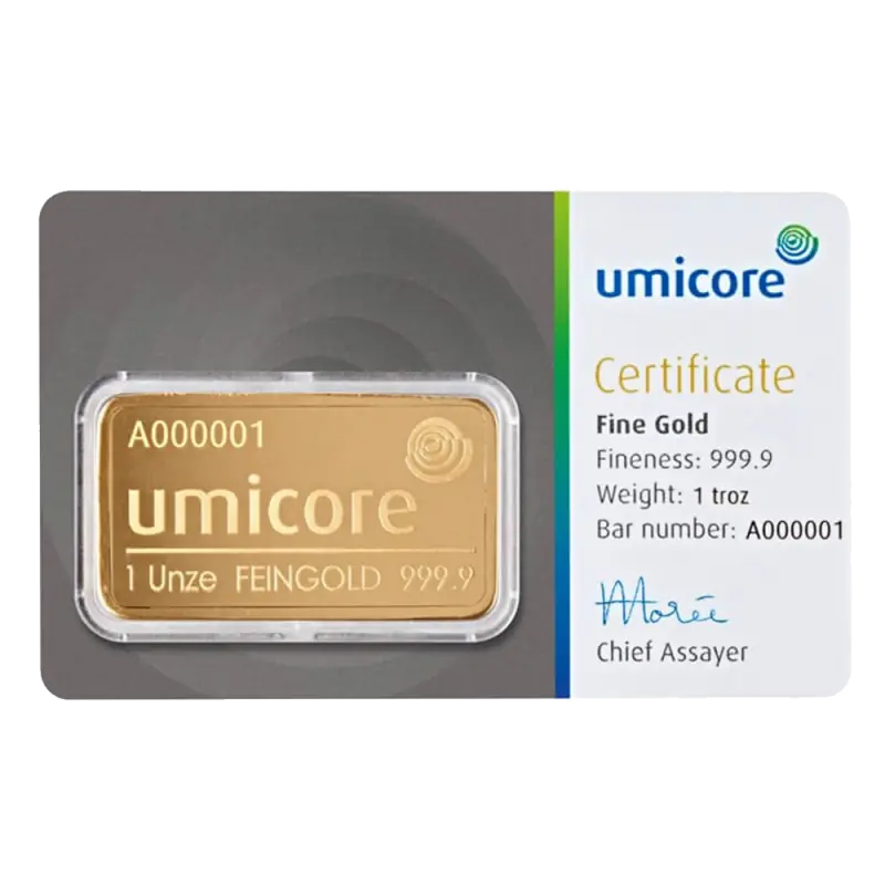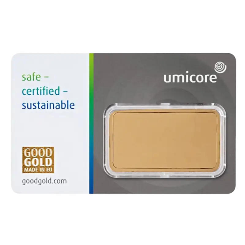 Investeer nu in de 1 oz Gouden Baar van Umicore en versterk jouw portfolio met de tijdloze waarde van goud.